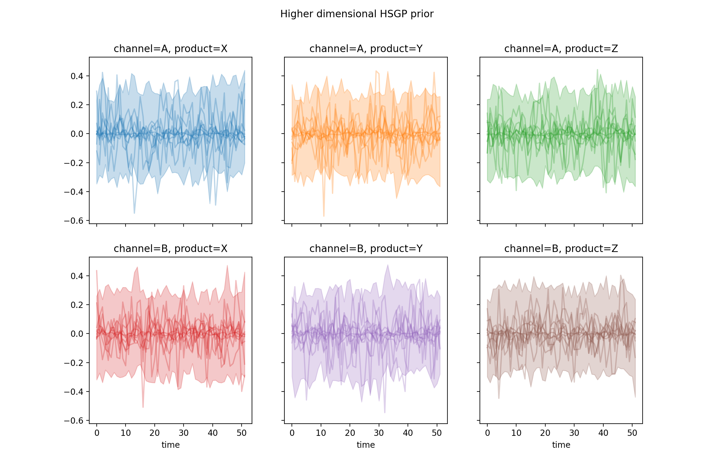 import numpy as np import pymc as pm import matplotlib.pyplot as plt from pymc_marketing.mmm import HSGP seed = sum(map(ord, "Higher dimensional HSGP")) rng = np.random.default_rng(seed) n = 52 X = np.arange(n) hsgp = HSGP.parameterize_from_data( X=X, dims=("time", "channel", "product"), ) coords = { "time": range(n), "channel": ["A", "B"], "product": ["X", "Y", "Z"], } prior = hsgp.sample_prior(coords=coords, random_seed=rng) curve = prior["f"] fig, _ = hsgp.plot_curve( curve, random_seed=rng, subplot_kwargs={"figsize": (12, 8), "ncols": 3}, ) fig.suptitle("Higher dimensional HSGP prior") plt.show()