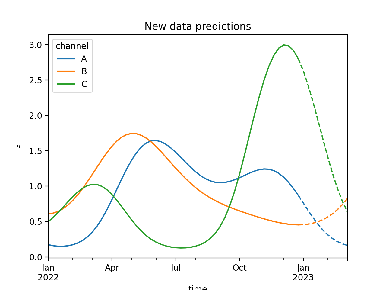 import numpy as np import pandas as pd import pymc as pm import matplotlib.pyplot as plt from pymc_marketing.mmm import SoftPlusHSGP from pymc_marketing.model_graph import deterministics_to_flat from pymc_extras.prior import Prior seed = sum(map(ord, "New data predictions with SoftPlusHSGP")) rng = np.random.default_rng(seed) eta = Prior("Exponential", lam=1) ls = Prior("InverseGamma", alpha=2, beta=1) hsgp = SoftPlusHSGP( eta=eta, ls=ls, m=20, L=150, dims=("time", "channel"), ) n = 52 X = np.arange(n) channels = ["A", "B", "C"] dates = pd.date_range("2022-01-01", periods=n, freq="W-MON") coords = {"time": dates, "channel": channels} with pm.Model(coords=coords) as model: data = pm.Data("data", X, dims="time") hsgp.register_data(data).create_variable("f") idata = pm.sample_prior_predictive(random_seed=rng) prior = idata.prior n_new = 10 X_new = np.arange(n - 1 , n + n_new) last_date = dates[-1] new_dates = pd.date_range(last_date, periods=n_new + 1, freq="W-MON") with deterministics_to_flat(model, hsgp.deterministics_to_replace("f")): pm.set_data( new_data={ "data": X_new, }, coords={"time": new_dates}, ) post = pm.sample_posterior_predictive( prior, var_names=["f"], random_seed=rng, ) chain, draw = 0, rng.choice(prior.sizes["draw"]) colors = [f"C{i}" for i in range(len(channels))] def get_sample(curve): return curve.loc[chain, draw].to_series().unstack() ax = prior["f"].pipe(get_sample).plot(color=colors) post.posterior_predictive["f"].pipe(get_sample).plot( ax=ax, color=colors, linestyle="--", legend=False ) ax.set(xlabel="time", ylabel="f", title="New data predictions") plt.show()